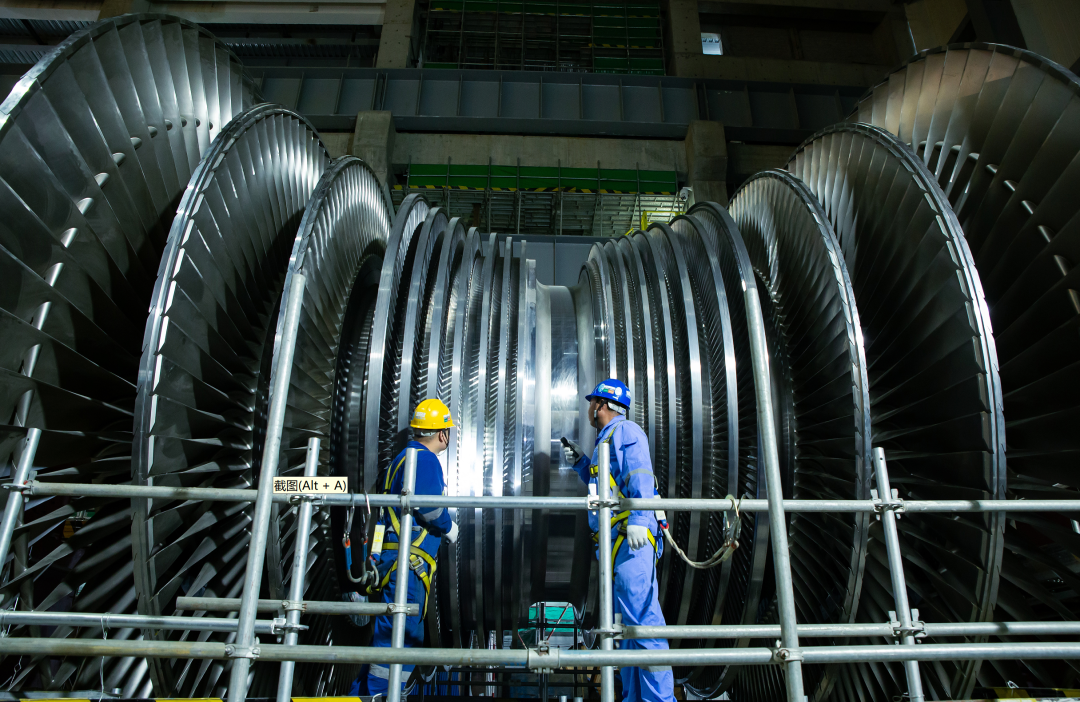 工作人員正在檢查一號機組汽輪機轉子。
