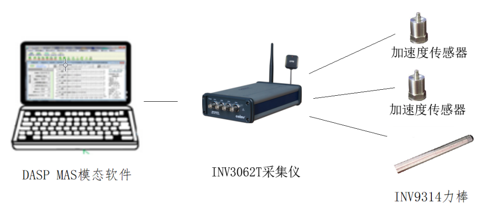 對于本次測試,激勵方法采用的是力錘激勵,選用的是型號是INV9314大型力棒,測力范圍達到100kN,特殊構造,含有先進的彈性聚能裝置,能有效增強激勵力和延長激勵時間,使激勵能量集中于低頻段,提高脈沖激勵響應的頻響函數分析精度,尤其適合大型低頻結構的激勵。