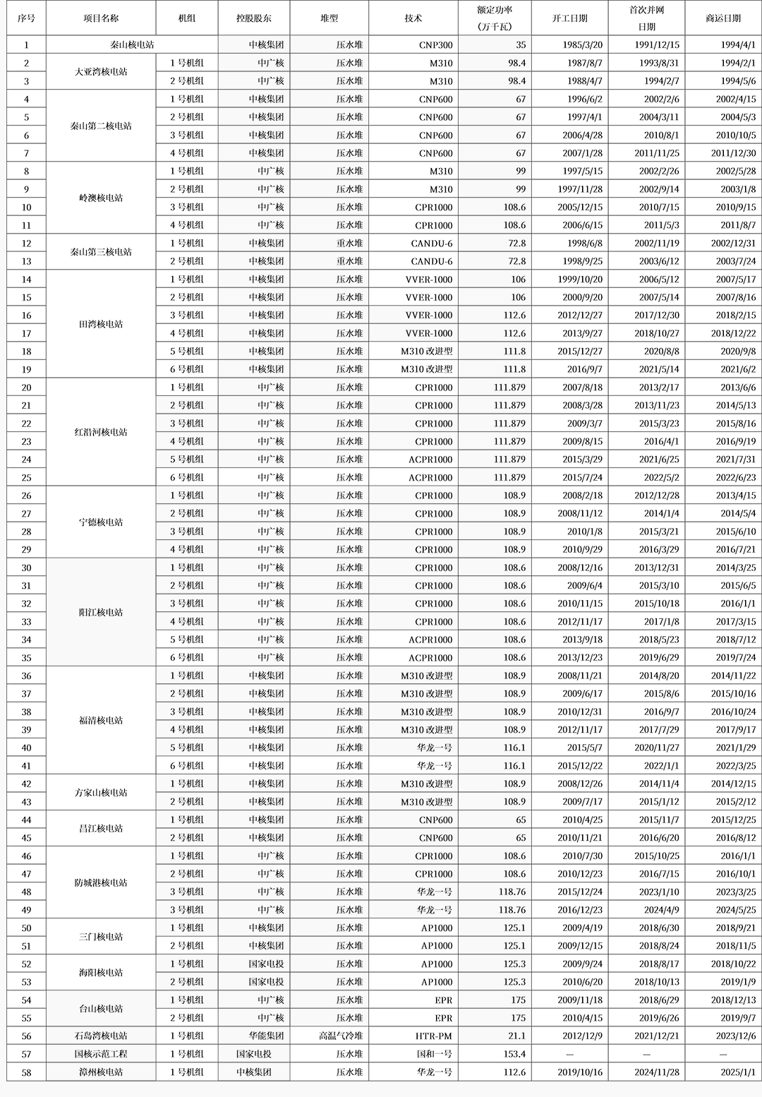表1:我國大陸在運核電機組情況(截至2024年12月31日)