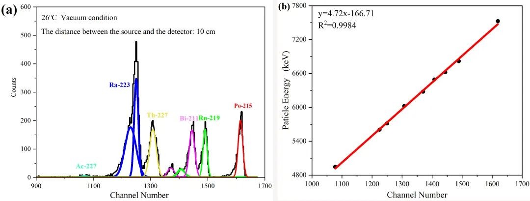 圖-2 4H-SiC SBD 器件的227Ac能譜(a)及線性響應(b)