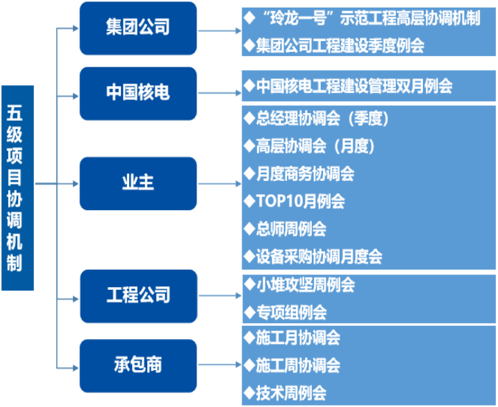 圍繞中核集團、中國核能電力股份有限公司、項目業主、工程公司、承包商五個層級建立海南小堆五級協調體系,通過保持目標一致性、優化資源整合分配、增強信息溝通共享等方式,調動一切資源,多層次聯動,及時解決工程建設各類問題,保障項目高質量建設。