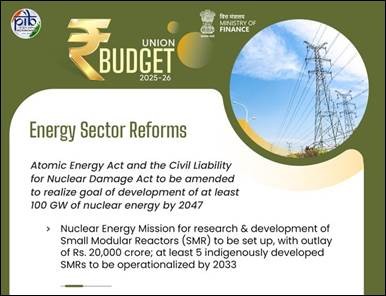 2025-26 年聯(lián)邦預(yù)算的一大亮點(diǎn)是啟動(dòng)核能計(jì)劃,該計(jì)劃的重點(diǎn)是小型模塊化反應(yīng)堆 (SMR) 的研發(fā)。政府已為該計(jì)劃撥款2000 億盧比,目標(biāo)是到 2033 年開(kāi)發(fā)至少五座自主設(shè)計(jì)和運(yùn)行的 SMR。