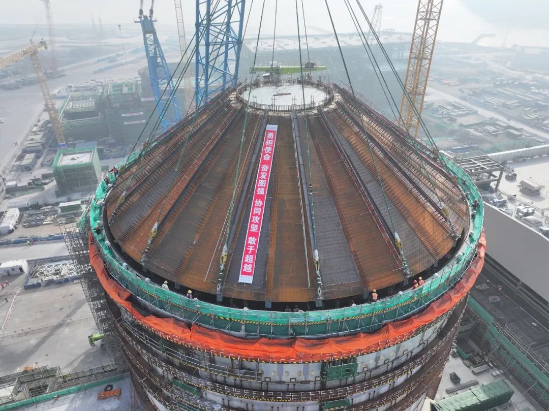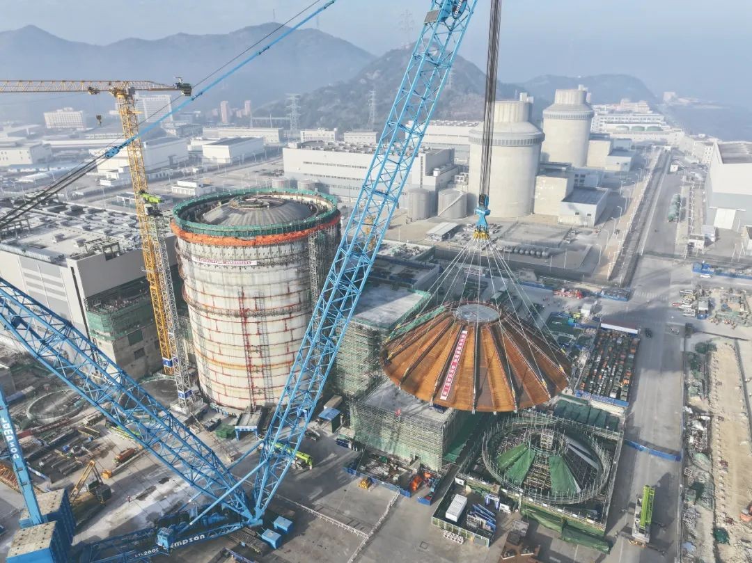 2025新年伊始,浙江三門灣畔,一座重達千噸的鋼穹頂在2600噸級履帶吊車的牽引下,穩穩落向三門核電3號核島頂部。這一刻,全球首臺CAP1000機組——三門核電二期工程3號機組實現了又一個里程碑節點——核島鋼穹頂吊裝就位。這一節點順利實現的背后,凝結了數百名建設者歷時8個月的智慧與汗水,是三門核電建設者不負囑托、用心打造標桿工程的寫照,更是三門核電人“追求卓越、保持領先、勇立潮頭”的集體宣言。