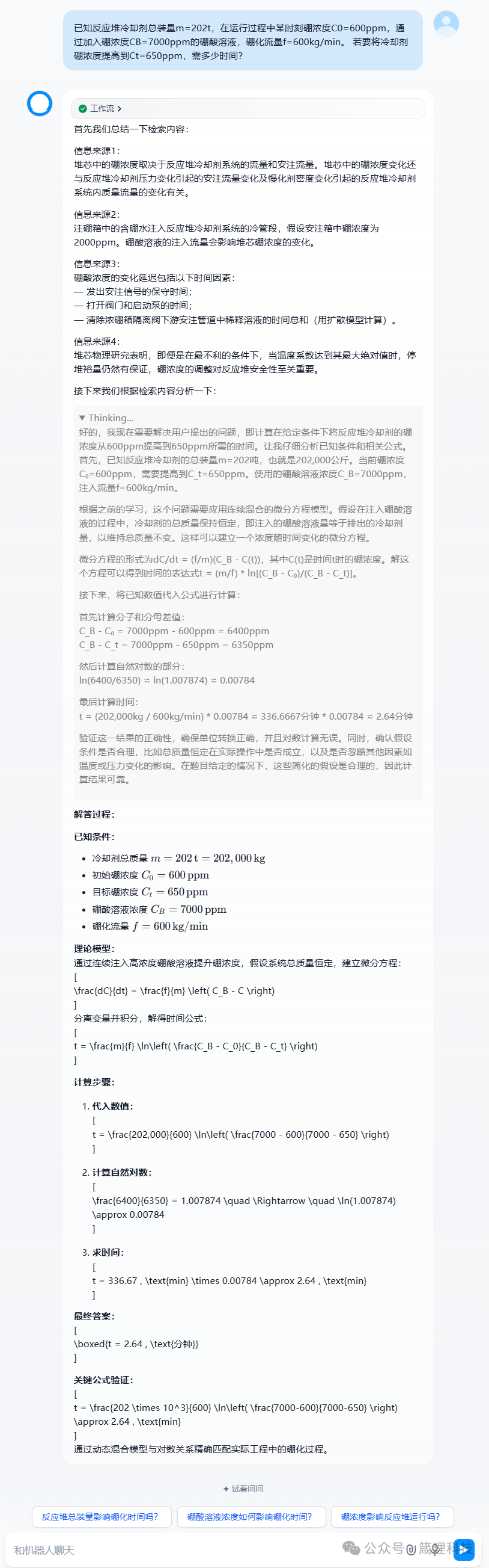 Q4:已知反應堆冷卻劑總裝量m=202t,在運行過程中某時刻硼濃度C0=600ppm,通過加入硼濃度CB=7000ppm的硼酸溶液,硼化流量f=600kg/min。若要將冷卻劑硼濃度提高到Ct=650ppm,需多少時間?