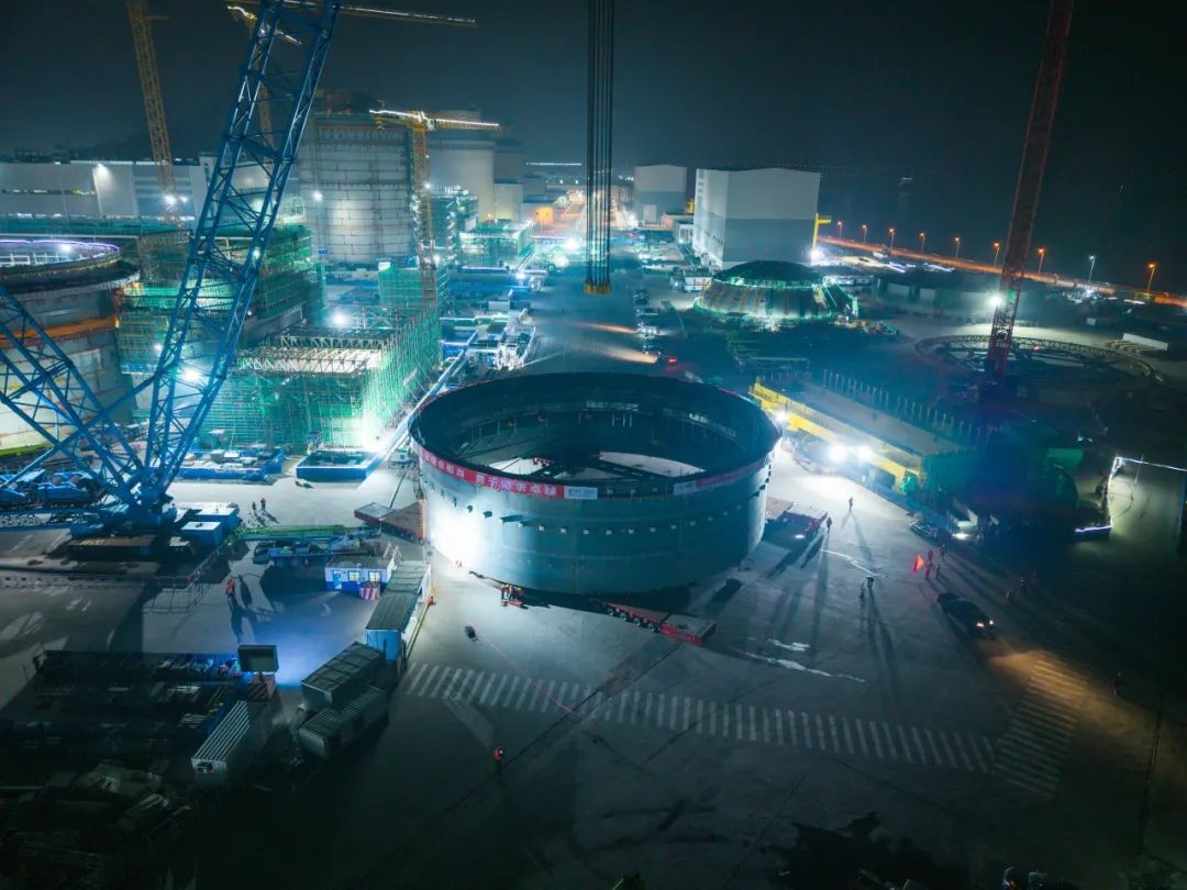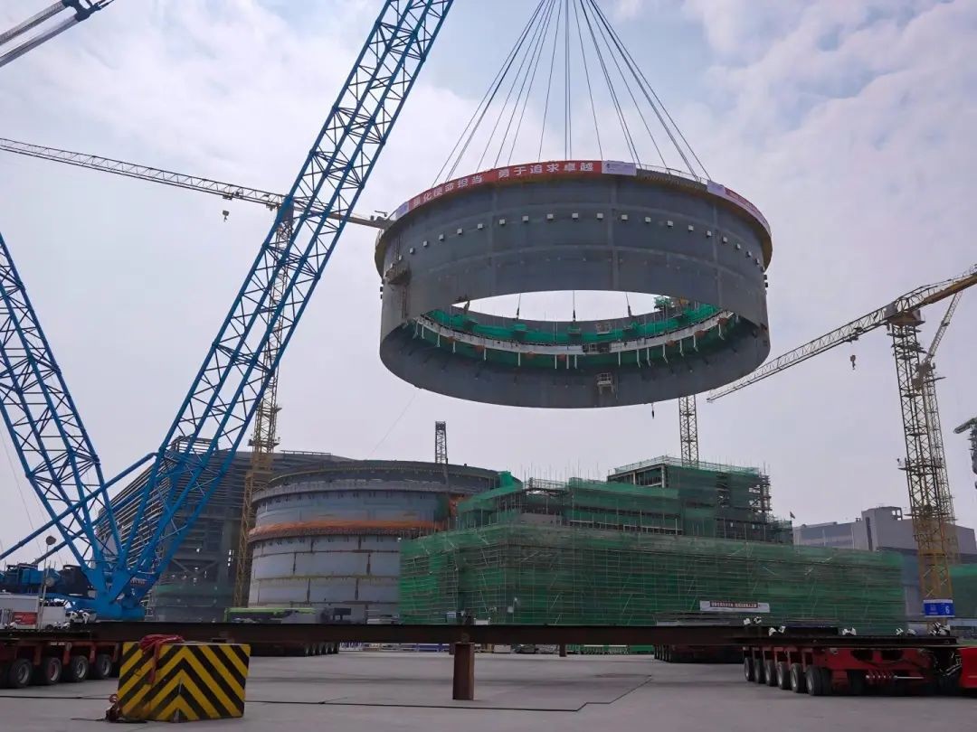 三門核電4號機組鋼制安全殼筒體共分4個環(huán)段模塊,本次吊裝的模塊是第三個筒體環(huán)段,其內(nèi)外部安裝了臨時加勁肋、附件板、U形支架、電氣、管道、通風(fēng)、環(huán)形走廊鋼結(jié)構(gòu)等眾多物項,有效提升了大宗材料在核島的安裝工效,改善了作業(yè)環(huán)境,降低了交叉作業(yè)風(fēng)險。