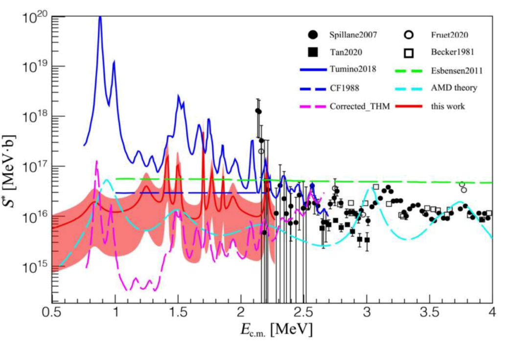 在此次研究中,原子能院核天體物理創(chuàng)新團隊與串列加速器運行團隊高度協(xié)作,利用HI-13串列加速器,采用23Na+p(鈉-23與質(zhì)子反應(yīng))厚靶逆運動學(xué)方法,對12C+12C熔合反應(yīng)相關(guān)的復(fù)合核24Mg*進行核能級性質(zhì)的研究,并基于對24Mg*衰變發(fā)射的γ射線、質(zhì)子、α粒子的同時測量,實現(xiàn)了γ-p、γ-α符合譜學(xué),成功鑒別出相關(guān)基態(tài)、激發(fā)態(tài),以及發(fā)射α粒子的不同衰變道。研究團隊獲得了相關(guān)反應(yīng)道的激發(fā)函數(shù),發(fā)現(xiàn)了復(fù)合核24Mg*有關(guān)激發(fā)能區(qū)復(fù)雜的共振能級結(jié)構(gòu),提取了復(fù)合核詳細的共振參數(shù),并成功給出了12C+12C熔合反應(yīng)的天體物理S因子及其不確定度范圍。