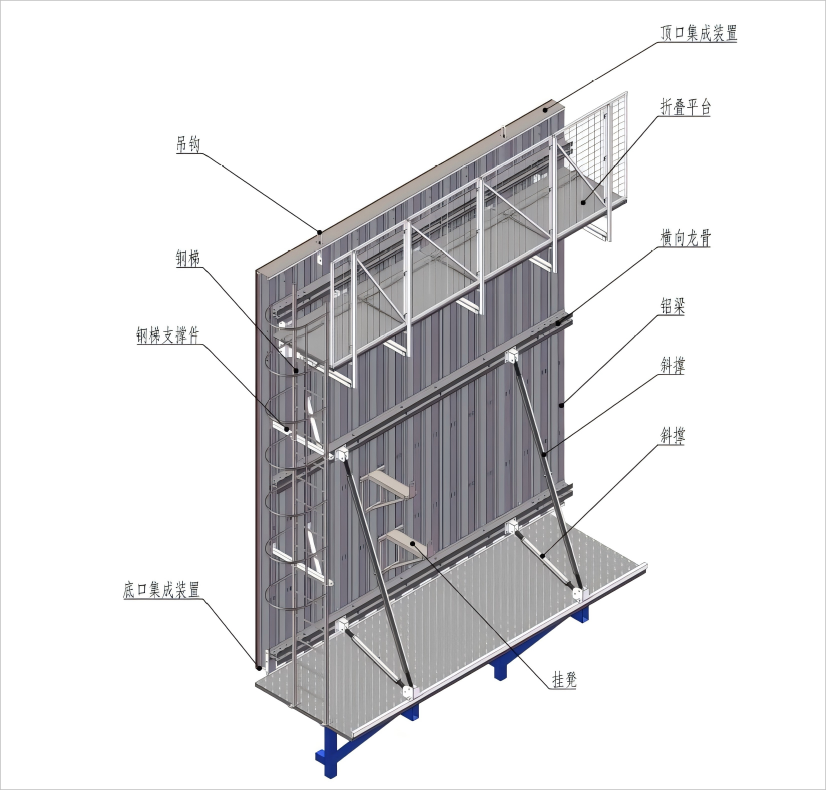 直行墻大模板通過多維度優化確保施工安全可靠。模板增設經結構強度、材料性能及防滑設計專項優化的專業起重吊裝吊鉤,可安全承載模板重量,實現穩定起吊與懸掛,降低吊裝隱患。加固采用M17高強拉桿自下而上進行,先在地面完成第一層、第二層高強拉桿安裝固定,再于模板結構上架設三角掛凳,并通過螺栓將折疊平臺與大模板體系牢固連接。模板頂口與底口配備集成裝置增強整體性,底部三角架開設直徑22mm孔洞并焊接M20螺母,與斜撐銷軸精準連接固定,提升整體穩定性。此外,大模板重復使用率高,能顯著降低材料損耗與人工成本,同時配套完善的安全防護措施與穩固支撐體系,可有效規避模板拆除過程中的安全事故,確保拆除作業安全有序開展。