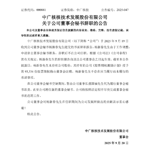 9月20日,中廣核技發(fā)布公告稱,公司于9月19日收到公司董事會秘書楊新春先生提交的書面辭職報(bào)告,楊新春先生由于工作調(diào)整,申請辭去董事會秘書職務(wù),辭職后不在公司任職。