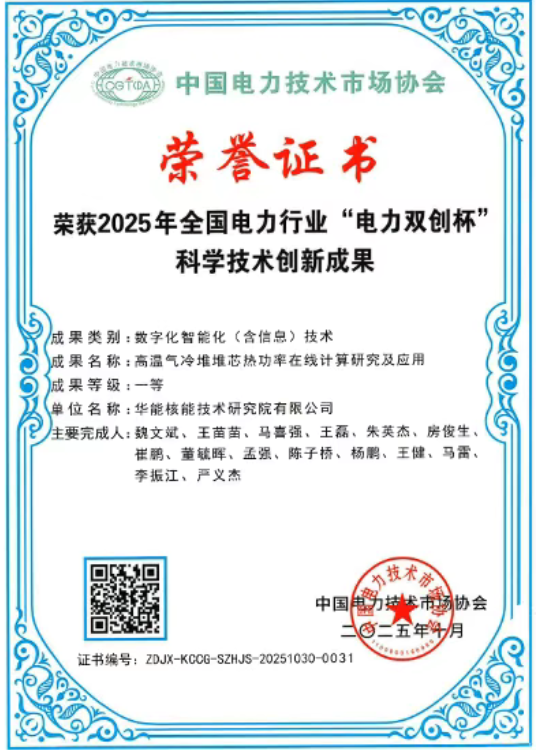 10月30日,中國電力技術市場協會正式公布2025年全國電力行業“電力雙創杯”評選結果,華能核能技術研究院自主研發的“高溫氣冷堆堆芯熱功率在線計算研究及應用”項目,榮獲科學技術創新成果一等獎,彰顯核能院在核電領域的研發實力和創新能力。