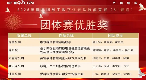 數(shù)字化轉(zhuǎn)型賽道上,由計劃部龐瑞、王子慕、肖文軒、信息文檔部盧藝聯(lián)合申報的“核電廠生產(chǎn)指標智能管理助手”作品,在中廣核數(shù)字化轉(zhuǎn)型技能競賽中摘得團體優(yōu)勝獎;盧藝榮獲個人優(yōu)勝獎。