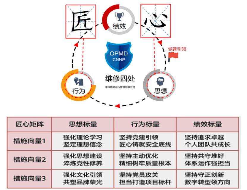 秦山核電維修四處長(zhǎng)期致力于部門(mén)核安全文化建設(shè),通過(guò)“三個(gè)強(qiáng)化、六個(gè)堅(jiān)持”系列舉措,實(shí)現(xiàn)黨建工作與核安全文化建設(shè)的有機(jī)融合。處室積極落實(shí)中核集團(tuán)核安全文化“863”動(dòng)作要領(lǐng),致力于構(gòu)建以黨建為引領(lǐng)、以核安全文化為基礎(chǔ)的維修安全體系,創(chuàng)建了“思想、行為、績(jī)效”黨建模型,倡導(dǎo)并踐行“思想引領(lǐng)行為、行為創(chuàng)造績(jī)效、績(jī)效提升思想”的良性循環(huán)。基于秦山核電公司“責(zé)任、安全、創(chuàng)新、協(xié)同”的核心價(jià)值觀,部門(mén)凝練出“匠心、擔(dān)當(dāng)、卓越、成長(zhǎng)”為核心的價(jià)值追求和“三個(gè)強(qiáng)化、六個(gè)堅(jiān)持”匠心矩陣具體舉措,將核安全文化建設(shè)原則和要素有效融入其中,有力推動(dòng)核安全文化在組織與員工層面的落地。