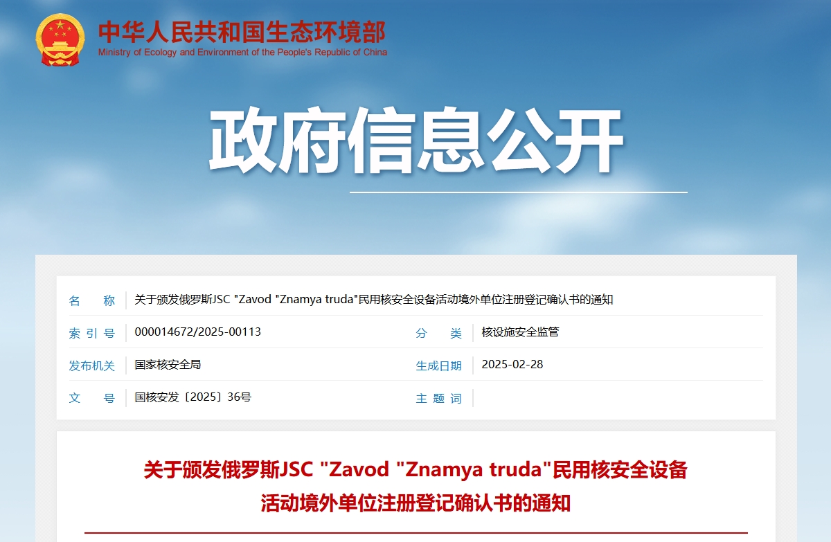 關于頒發俄羅斯JSC "Zavod "Znamya truda"民用核安全設備活動境外單位注冊登記確認書的通知