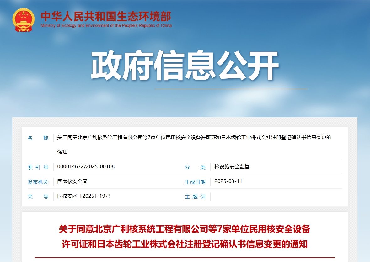 關于同意北京廣利核系統工程有限公司等7家單位民用核安全設備許可證和日本齒輪工業株式會社注冊登記確認書信息變更的通知