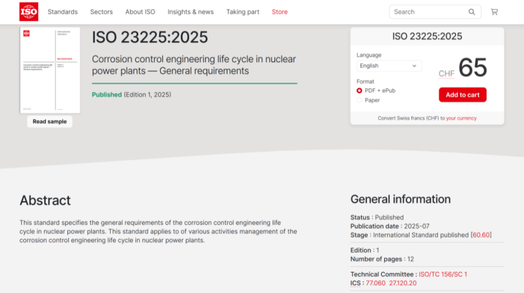 7月28日,由蘇州熱工研究院有限公司材料工程技術(shù)中心主導(dǎo)制訂的國際標(biāo)準(zhǔn)ISO 23225:2025 Corrosion control engineering life cycle in nuclear power plants— General requirements(中文譯名:核電廠腐蝕控制工程全生命周期通用要求)正式發(fā)布。該標(biāo)準(zhǔn)成為中國廣核集團(tuán)在核電領(lǐng)域首個(gè)主導(dǎo)制訂并成功發(fā)布的國際標(biāo)準(zhǔn)。▲中廣核蘇州院主導(dǎo)制訂的國際標(biāo)準(zhǔn)ISO23225正式發(fā)布(來源:ISO官網(wǎng))ISO 23225國際標(biāo)準(zhǔn)是由中國倡