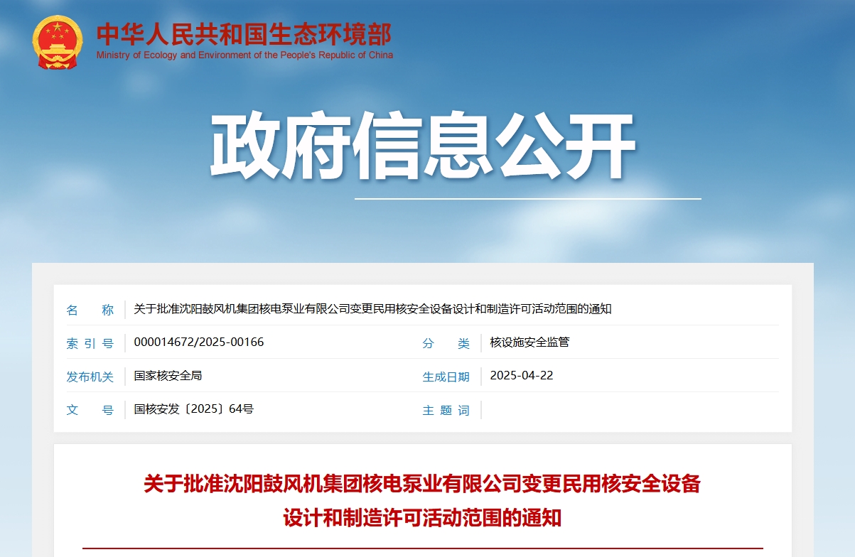 關于批準沈陽鼓風機集團核電泵業有限公司變更民用核安全設備設計和制造許可活動范圍的通知沈陽鼓風機集團核電泵業有限公司:你公司《關于申請辦理民用核安全機械設備設計及制造許可證變更的請示》(沈鼓核電發[2023]33號)收悉。經研究,通知如下。根據《中華人民共和國核安全法》《民用核安全設備監督管理條例》及其配套規章的要求,我局對你公司民用核安全設備設計和制造許可活動范圍變更申請進行了審查,認為你公司在所申請的民用核安全設...