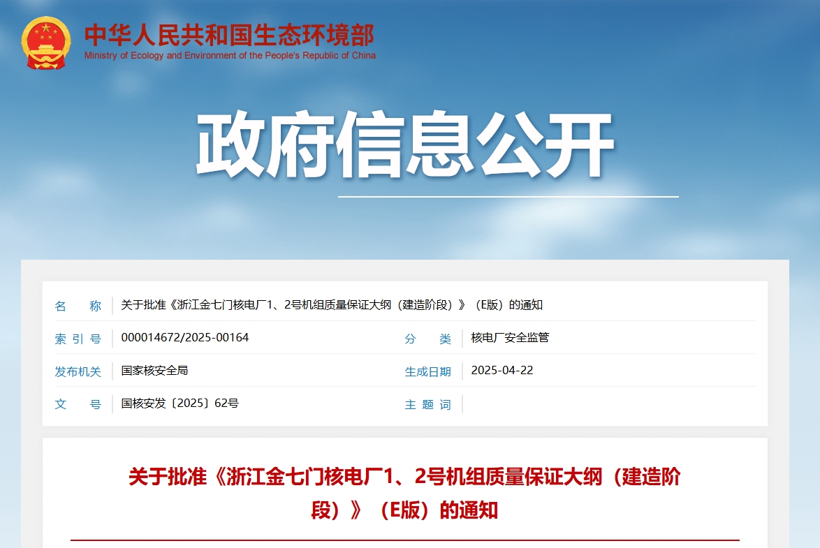 關于批準《浙江金七門核電廠1、2號機組質量保證大綱(建造階段)》(E版)的通知中核浙能能源有限公司:你公司《關于審批〈浙江金七門核電廠1、2號機組質量保證大綱(建造階段)〉(C版)的請示》(中核浙能核安發〔2024〕 43號)、《關于懇請批復〈浙江金七門核電廠1、2號機組質量保證大綱(建造階段)〉(E版)的請示》(中核浙能核安發〔2025〕2號)收悉。根據《中華人民共和國核安全法》和《中華人民共和國民用核設施安全監督管理條例》的有關要...