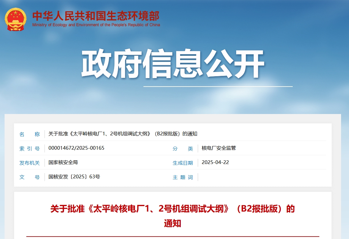 關于批準《太平嶺核電廠1、2號機組調試大綱》(B2報批版)的通知中廣核惠州核電有限公司:你公司《關于呈報〈太平嶺核電廠1、2號機組調試大綱(B1版)〉的函》(廣核惠函〔2024〕68號)、《關于懇請審批太平嶺核電廠1、2號機組調試大綱(B2報批版)的請示》(廣核惠〔2025〕9號)收悉。根據《中華人民共和國核安全法》《中華人民共和國民用核設施安全監督管理條例》的有關要求,我局對你公司提交的申請文件進行了技術審評,認為你公司《太平嶺核電...