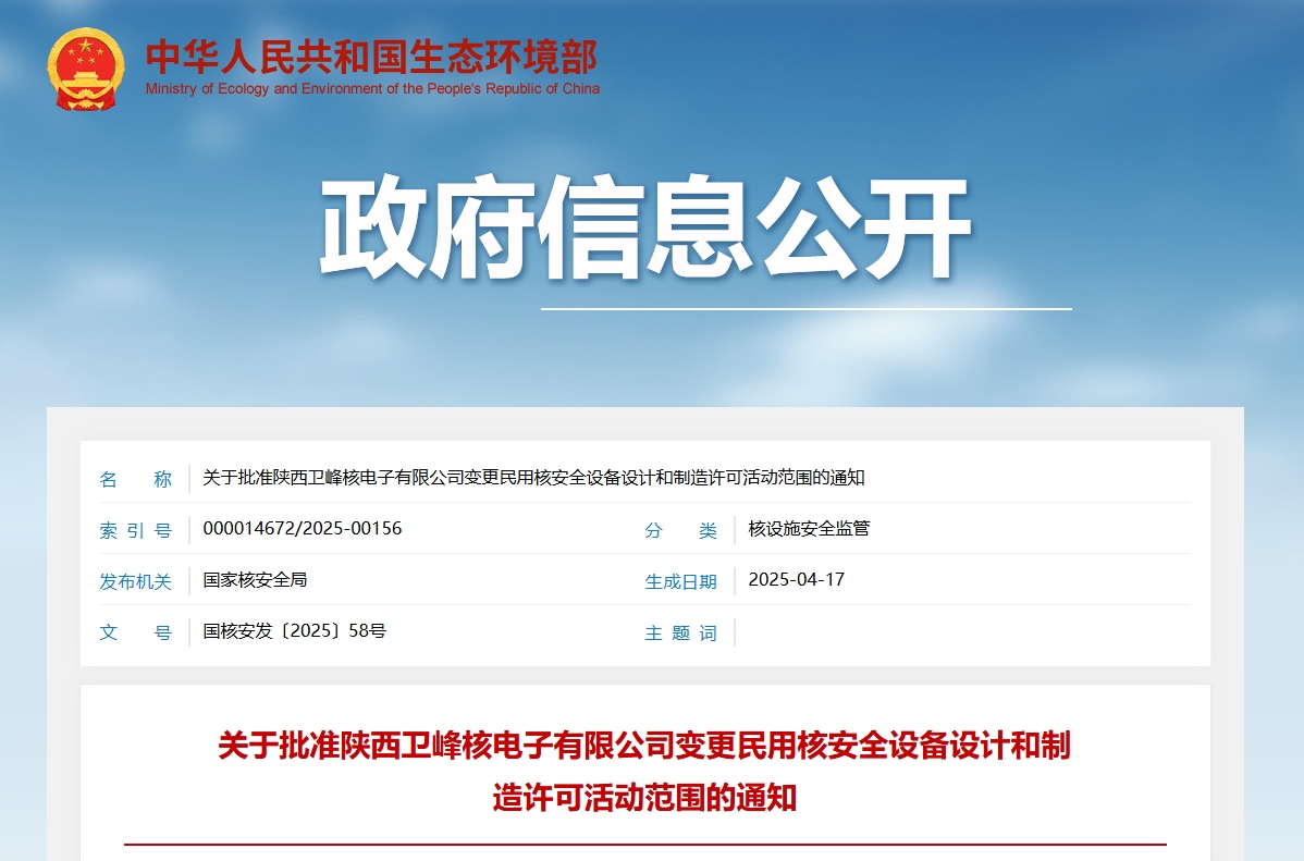 關于批準陜西衛(wèi)峰核電子有限公司變更民用核安全設備設計和制造許可活動范圍的通知