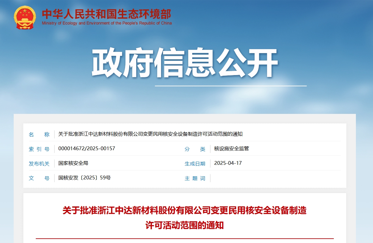 關于批準浙江中達新材料股份有限公司變更民用核安全設備制造許可活動范圍的通知