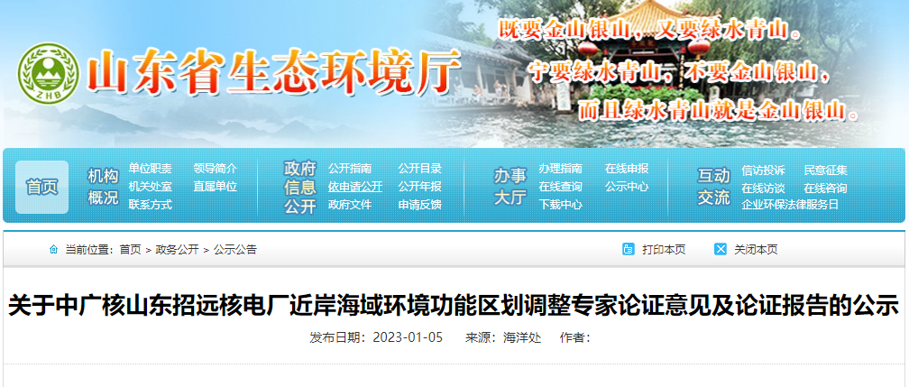 關(guān)于中廣核山東招遠核電廠近岸海域環(huán)境功能區(qū)劃調(diào)整專家論證意見及論證報告的公示