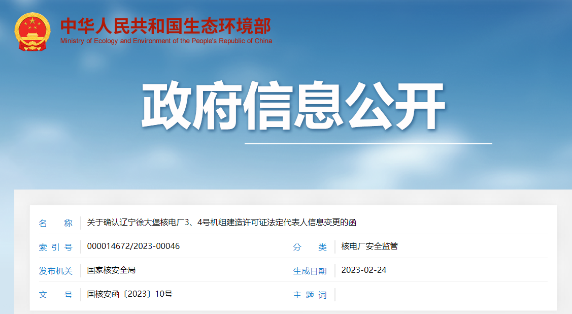 關(guān)于確認遼寧徐大堡核電廠3、4號機組建造許可證法定代表人信息變更的函