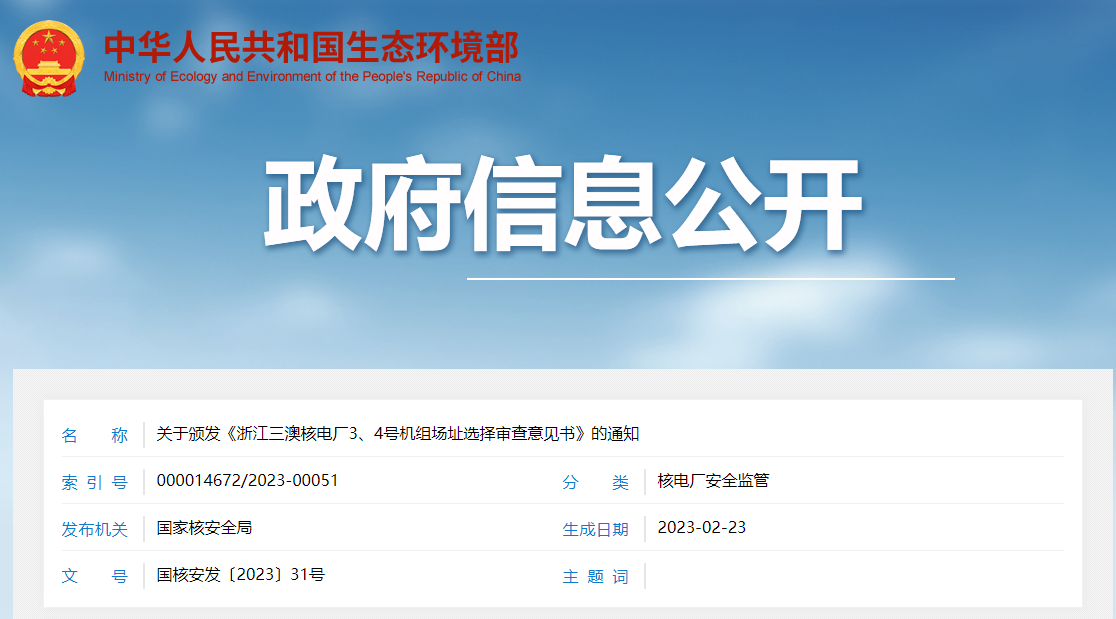 關(guān)于頒發(fā)《浙江三澳核電廠3、4號機組場址選擇審查意見書》的通知