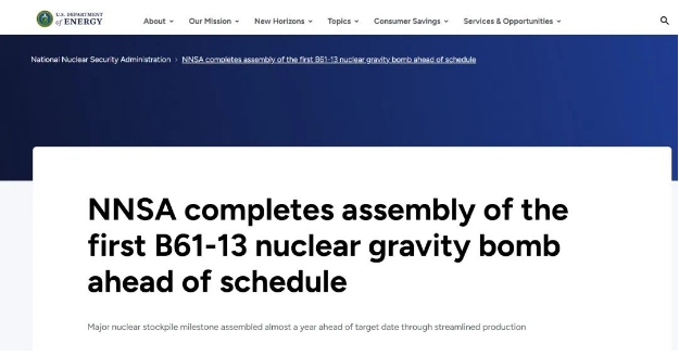 據美國能源部稱,新型核彈B61-13的首個生產型號已經完成制造,完成時間比原計劃提前了大約一年。B61-13是在之前型號B61-12核彈的基礎上開發的,但具有更高的爆炸當量。據稱,B61-13的最大當量預計在340至360千噸之間TNT炸藥,而作為對比,1945年美軍投向日本廣島的原子彈的爆炸當量為15千噸,這意味著B61-13的威力是廣島原子彈的20倍以上。美國官員還聲稱,B61-13具備重要的額外能力,可以威脅到地下指揮和控制設施以及分布在更大區域的固定目標。美...