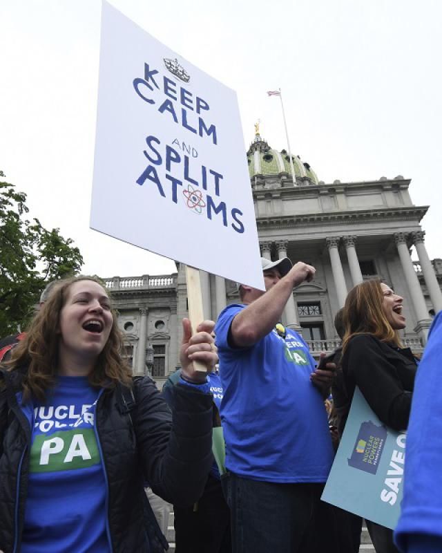 賓夕法尼亞州核電站工人們聚集在國會大廈爭論關于核電的法案,
