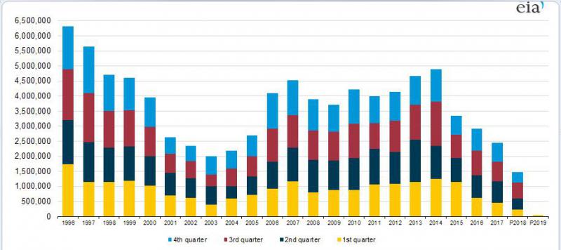 美國鈾濃縮(U3O8)在2019年第一季度的產量為58,481磅,比2018年第四季度下降了83%,比2018年第一季度下降了74%。在2019年第一季度,美國鈾生產于四個美國鈾設施,比2018年第四季度少兩個。