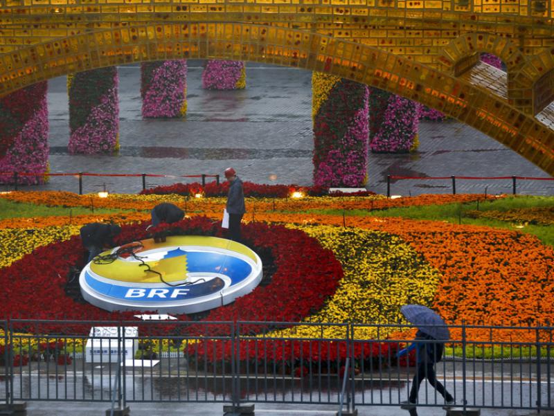 中國國家主席習近平在北京主持的一帶一路論壇圓桌會議上,工人們拆除了媒體中心外“絲綢之路金橋”結構旁邊的“一帶一路”論壇標志, 2019.