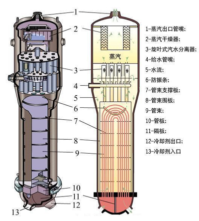 蒸汽發(fā)生器(SG)作為電廠連接一回路和二回路主要熱交換設(shè)備,將一回路冷卻劑中的熱量傳給二回路給水,使其產(chǎn)生飽和蒸汽供給二回路動(dòng)力裝置,單機(jī)組在反應(yīng)堆冷卻劑系統(tǒng)中共有三個(gè)環(huán)路,每個(gè)環(huán)路上裝有一臺(tái)蒸汽發(fā)生器,每臺(tái)容量按滿功率運(yùn)行時(shí)傳遞三分之一的反應(yīng)堆熱功率設(shè)計(jì)。