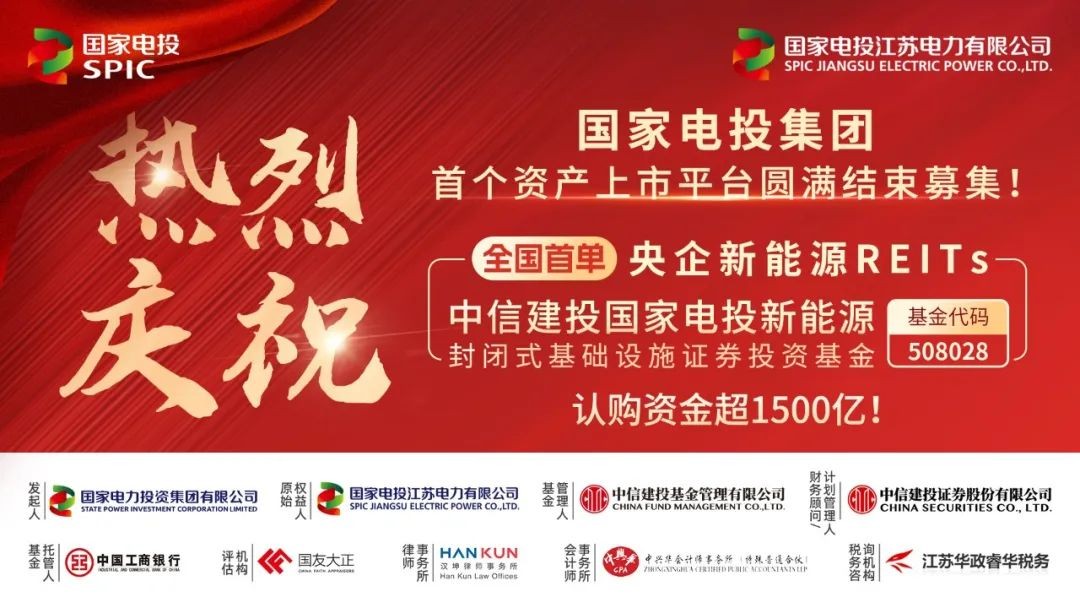 3月14日,國家電投作為發起人、江蘇公司作為原始權益人發起的國家電投新能源封閉式基礎設施證券投資基金(簡稱“國家電投新能源REIT”,基金代碼:508028)正式完成發行。