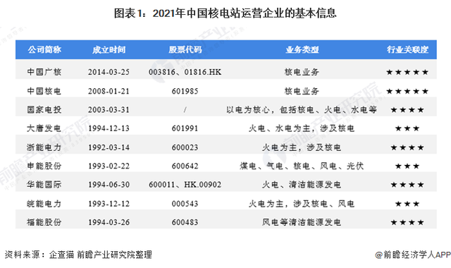 核電是我國能源供應體系的重要分支,也是新能源的重要組成部分。目前,我國核電行業-核電站運營企業的數量不多,因存在嚴格的行政準入門檻、資金門檻和技術門檻等,主要公司包括:中國廣核、中國核電、國家電投大唐發電等。