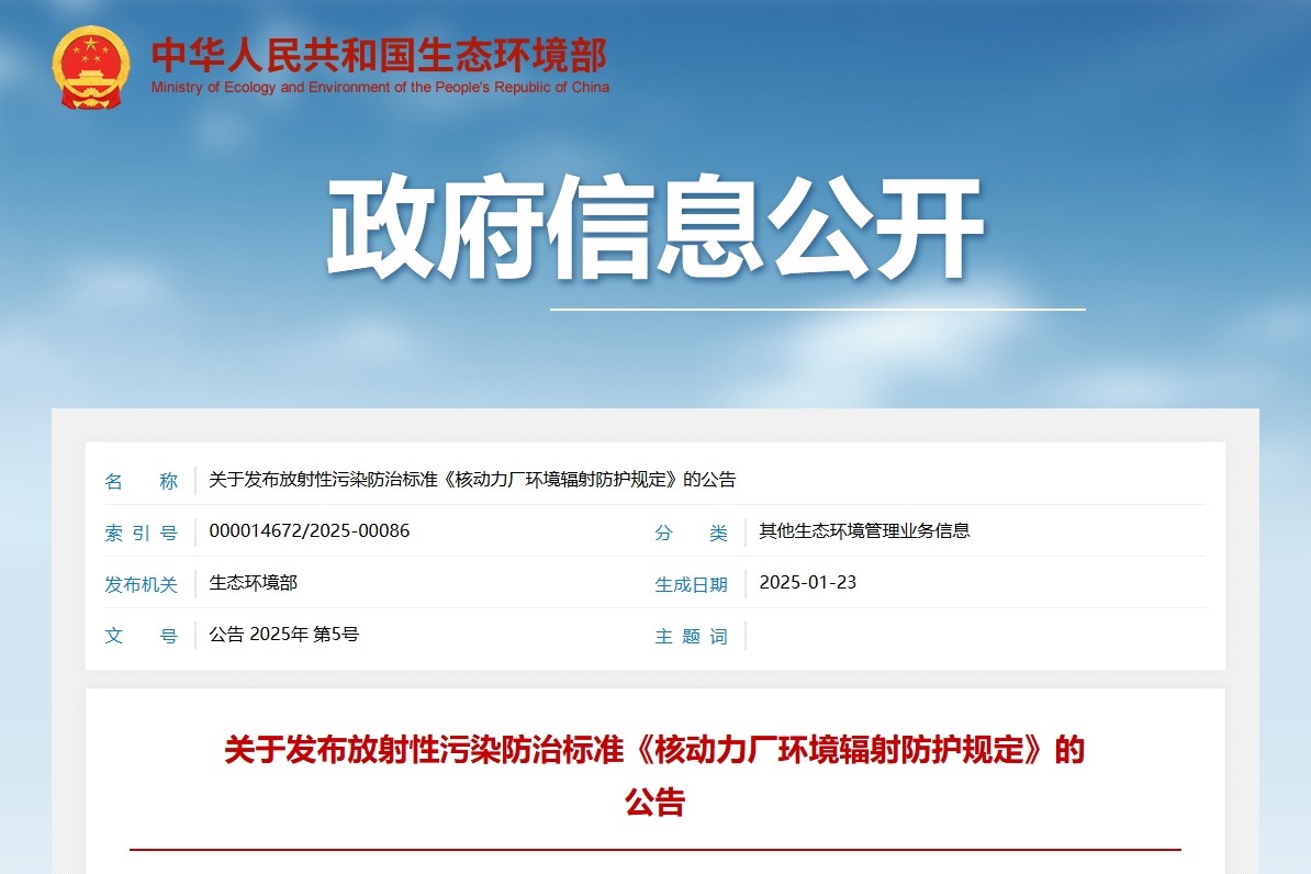 為貫徹《中華人民共和國環境保護法》和《中華人民共和國放射性污染防治法》,防治環境污染,改善生態環境質量,現批準《核動力廠環境輻射防護規定》為放射性污染防治標準,并由生態環境部與國家市場監督管理總局聯合發布。