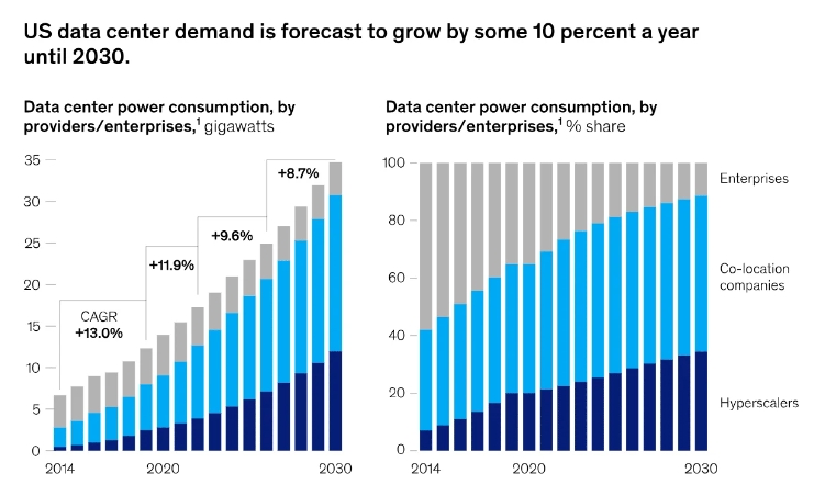 美國數據中心功耗將大幅飆升,從 2022 年的 17 吉瓦 (GW) 增加到 2030 年的 35 吉瓦。這種增長部分歸結于越來越多地使用更高功率的芯片來滿足要求較高的工作負載,在生成式人工智能淘金熱中,市場專家強調,電力才是AI該行業最大的挑戰。包括亞馬遜、微軟、Meta和Alphabet,都在持續擴大其數據中心業務。核電是理想的選擇,它安全、高效、能可持續地滿足數據中心的龐大能源需求。Constellation Energy 首席執行官 Joseph Dominguez 表示:公司正...