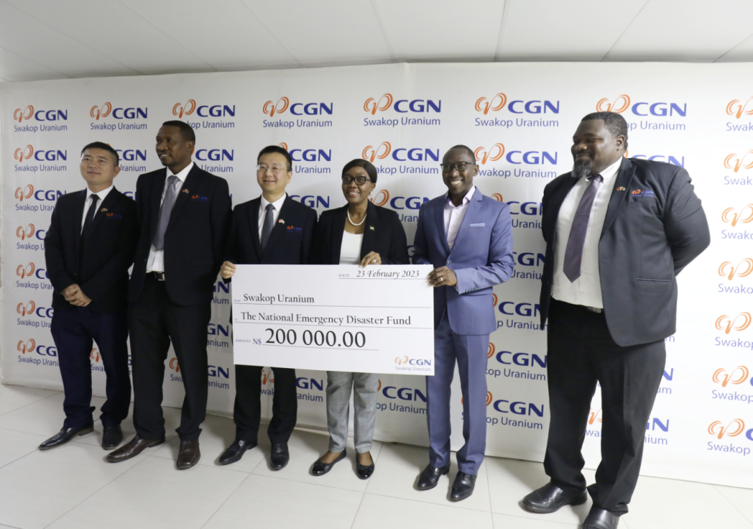 近日,中廣核鈾業斯科有限公司向納米比亞救災基金捐資20萬元納幣,用于幫助納米比亞北部因洪澇災害受災人員重建家園。納米比亞總理莎拉·庫貢蓋盧瓦(Saara Kuugongelwa)代表總理府接受了捐贈。埃龍戈省省長內維爾·安德烈(Neville Andre Itope),中廣核鈾業發展有限公司副總經理、斯科公司總經理邱斌等出席了捐贈儀式。