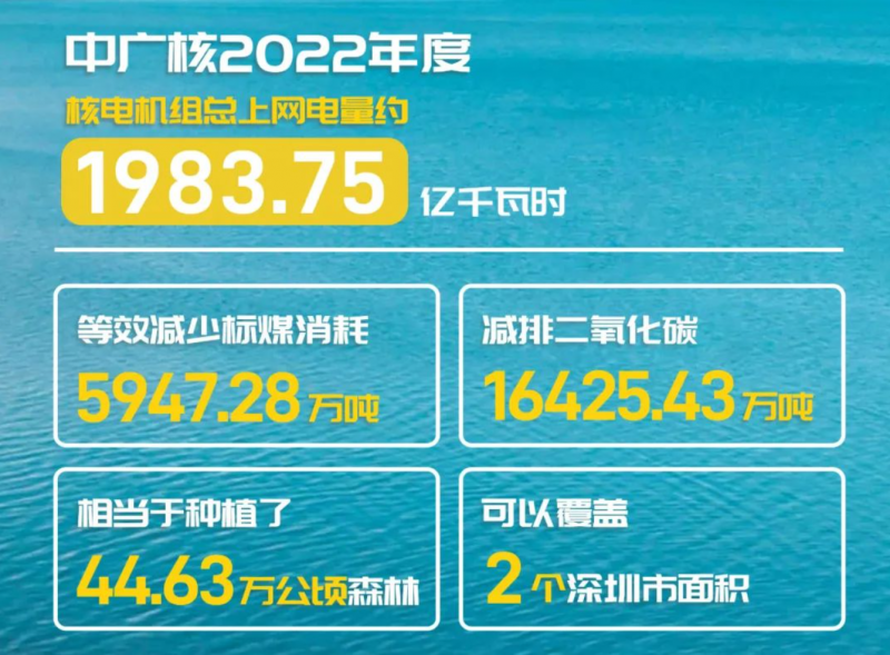 2023年1月9日,中國廣核電力股份有限公司發(fā)布信息公告,2022年1月至12月份,中國廣核電力股份有限公司運營管理的26臺在運核電機組總發(fā)電量約為2113.14億千瓦時,總上網(wǎng)電量約為1983.75億千瓦時,減排二氧化碳超1.64億噸,等效減少標(biāo)煤消耗5947.28萬噸,相當(dāng)于種植了超過44萬公頃森林。