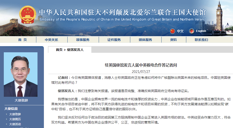 今日有英國媒體報道,消息人士稱英國政府正在考慮如何將中廣核剔除出英國未來的核電項目。中國駐英國使館對此有何評論?