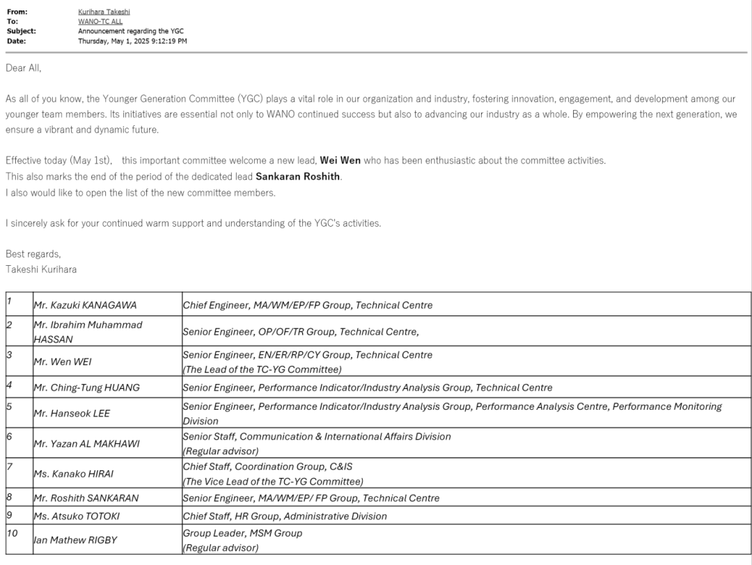 近日,中國核電(股票代碼:601985)旗下海南核電借調(diào)于世界核電運營者(WANO)東京中心的魏文被正式任命為Younger Generation(YG)委員會主席(TC YG Lead)。作為東京中心歷史上首位由中國公司推薦并承擔(dān)該工作的青年代表,魏文的任命體現(xiàn)了國際組織對中國青年工程師能力與潛力的高度認(rèn)可,也為中國核電青年人才在國際核能治理體系中的成長與發(fā)聲提供寶貴機遇和廣闊舞臺。WANO YG背景簡介為積極應(yīng)對潛在的人才斷層問題,WANO于2014年發(fā)起Young Gen...