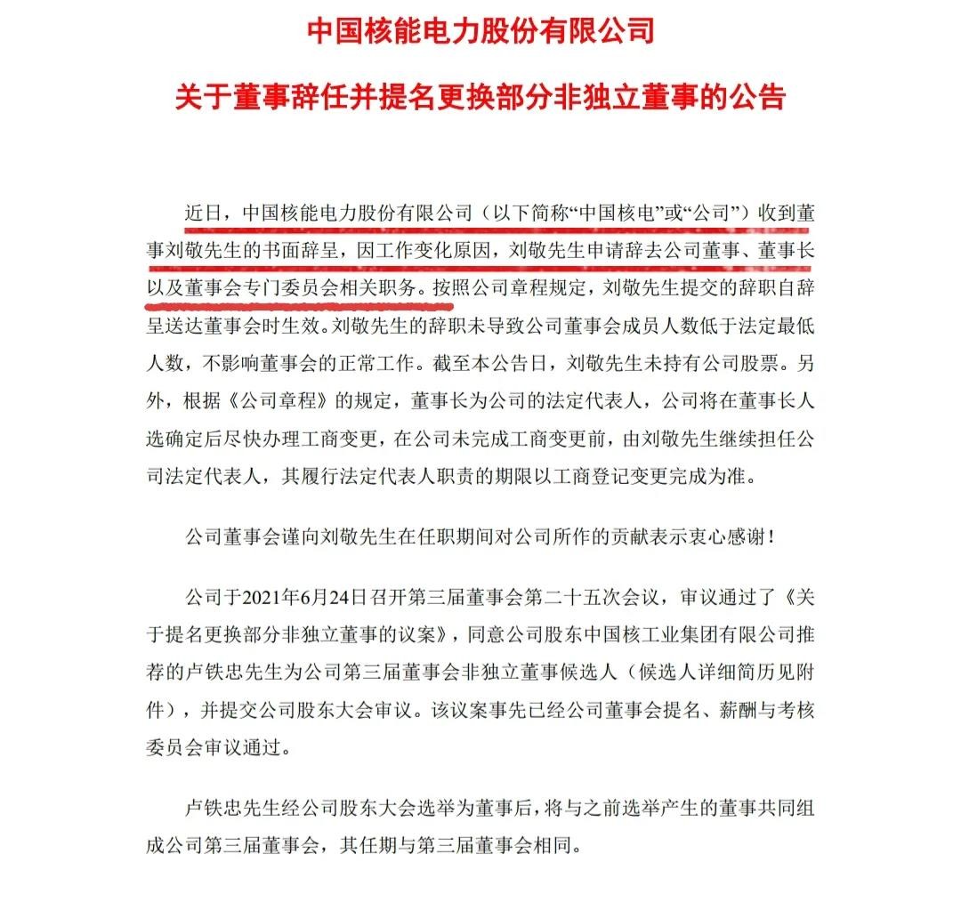 中國核電公告,公司董事劉敬先生因工作變化原因,申請辭去公司董事、董事長以及董事會專門委員會相關職務。根據《公司章程》的規定,董事長為公司的法定代表人,公司將在董事長人選確定后盡快辦理工商變更,在公司未完成工商變更前,由劉敬先生繼續擔任公司法定代表人。