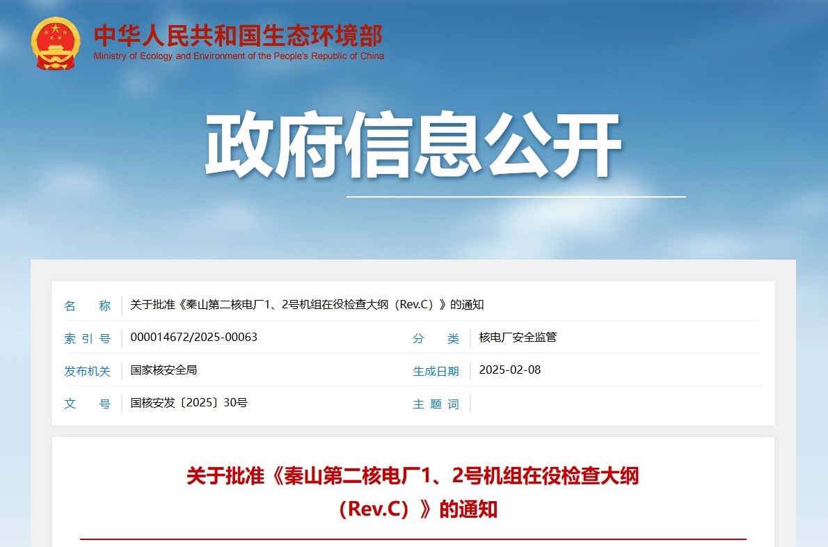 你公司《關于秦山第二核電廠1、2號機組在役檢查大綱(Rev.B)升版的請示》(中核運行核安發〔2023〕100號)、《關于懇請批準秦山第二核電廠1、2號機組在役檢查大綱(Rev.C)的請示》(中核運行核安發〔2025〕15號)收悉。