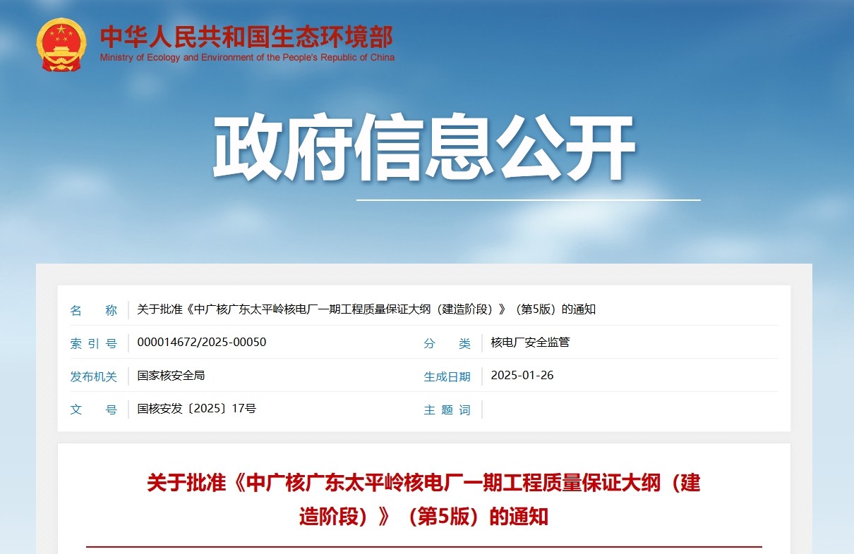關于批準《中廣核廣東太平嶺核電廠一期工程質量保證大綱(建造階段)》(第5版)的通知