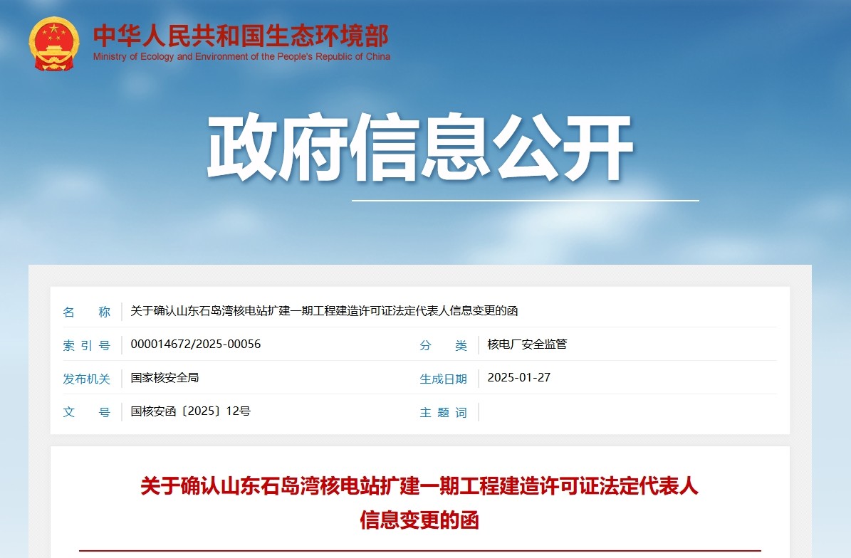 你公司《關于變更山東石島灣核電站擴建一期工程建造許可證法定代表人信息的請示》(石核開發執〔2025〕1號)收悉。