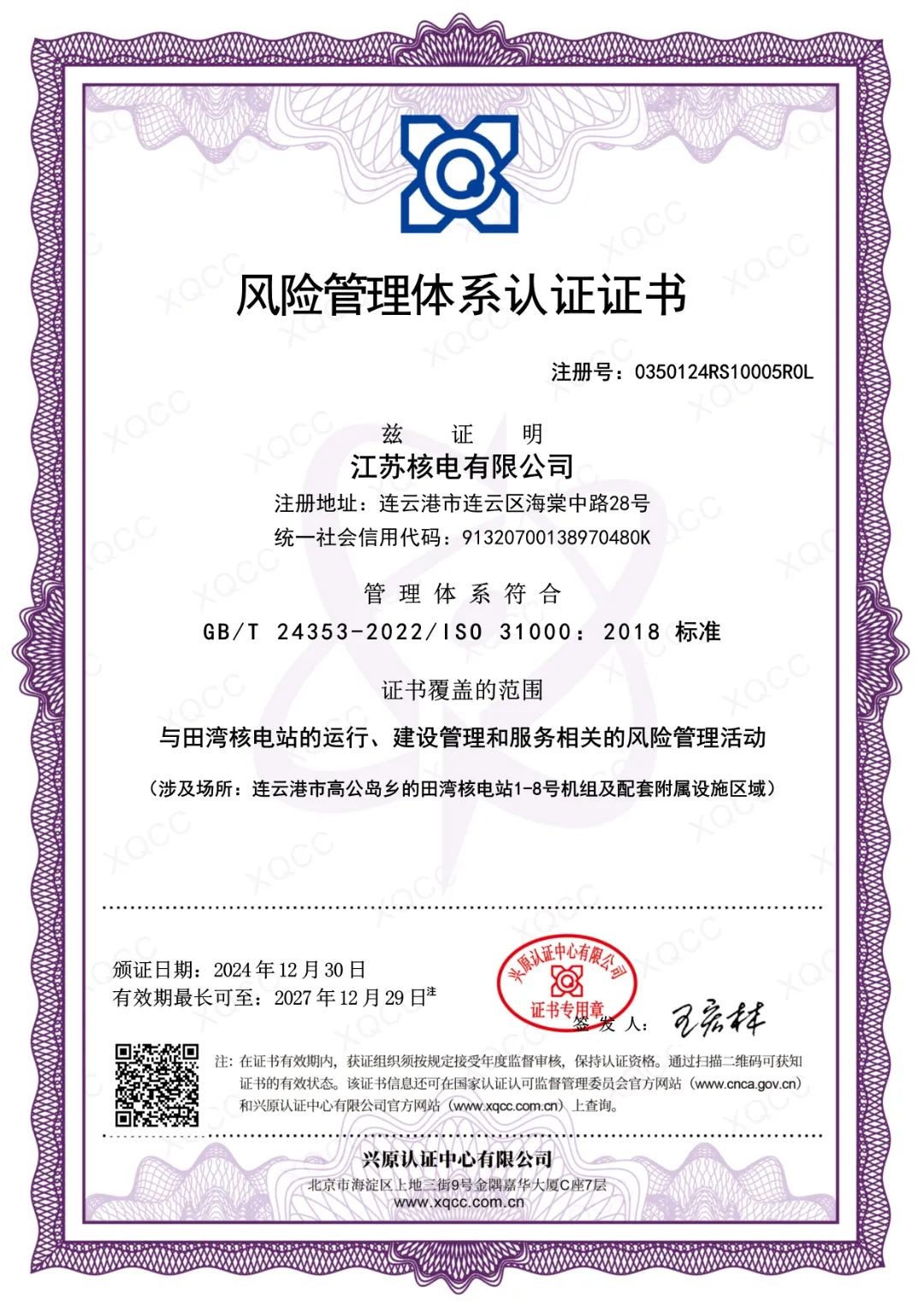 2024年12月30日,江蘇核電成功通過風險管理和合規管理體系審核,獲得興原認證中心頒發的GB/T 24353-2022/ISO 31000:2018《風險管理指南》和GB/T 35770-2022/ISO 37301:2021《合規管理體系要求及使用指南》風險管理和合規管理體系認證證書,成為中核集團首家獲得風險管理和合規管理體系雙認證的單位。