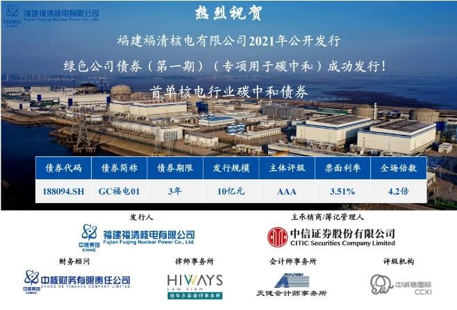5月10日,福清核電發(fā)行核電行業(yè)首單“碳中和”綠色公司債券。作為年度第一期綠色公司債券,本期債券規(guī)模10億元,期限3年,票面利率3.51%。