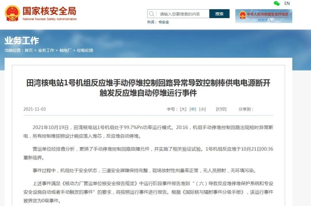?田灣核電站1號機組發(fā)生一起0級運行事件