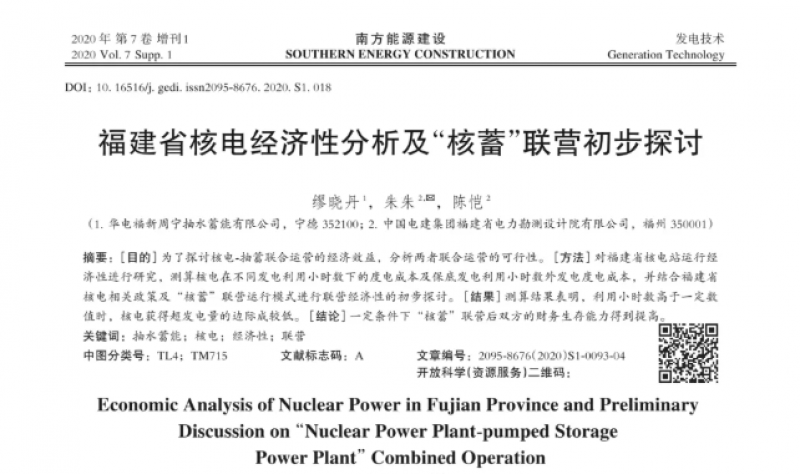 福建省核電經濟性分析及“核蓄”聯營初步探討