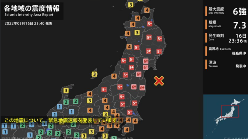 據日本氣象廳消息,當地時間3月16日23時37分左右,日本福島縣附近海域發生里氏7.3級地震,震度為6強。受此影響,位于茨城縣東海村的東海第二核電站已停止運轉,目前正在確認核電站是否受到了地震影響。