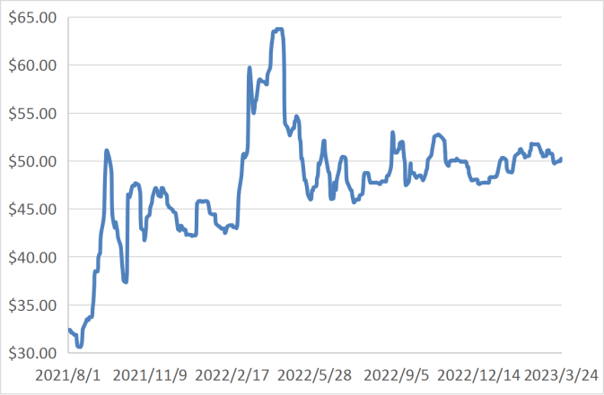 天然鈾市場(chǎng)方面,現(xiàn)貨交付期的供應(yīng)稀少,貿(mào)易商觀望市場(chǎng),沒有急于往市場(chǎng)銷售庫(kù)存。上周現(xiàn)貨鈾價(jià)大部分時(shí)間維持在50美元/磅,周五價(jià)格回升以50.25美元/磅收盤。