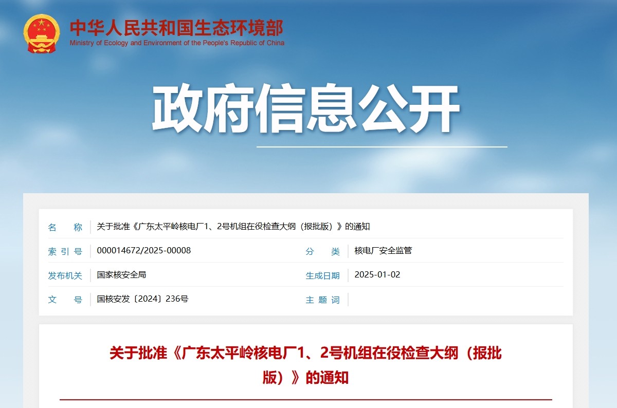 關(guān)于批準(zhǔn)《廣東太平嶺核電廠1、2號(hào)機(jī)組在役檢查大綱(報(bào)批版)》的通知
